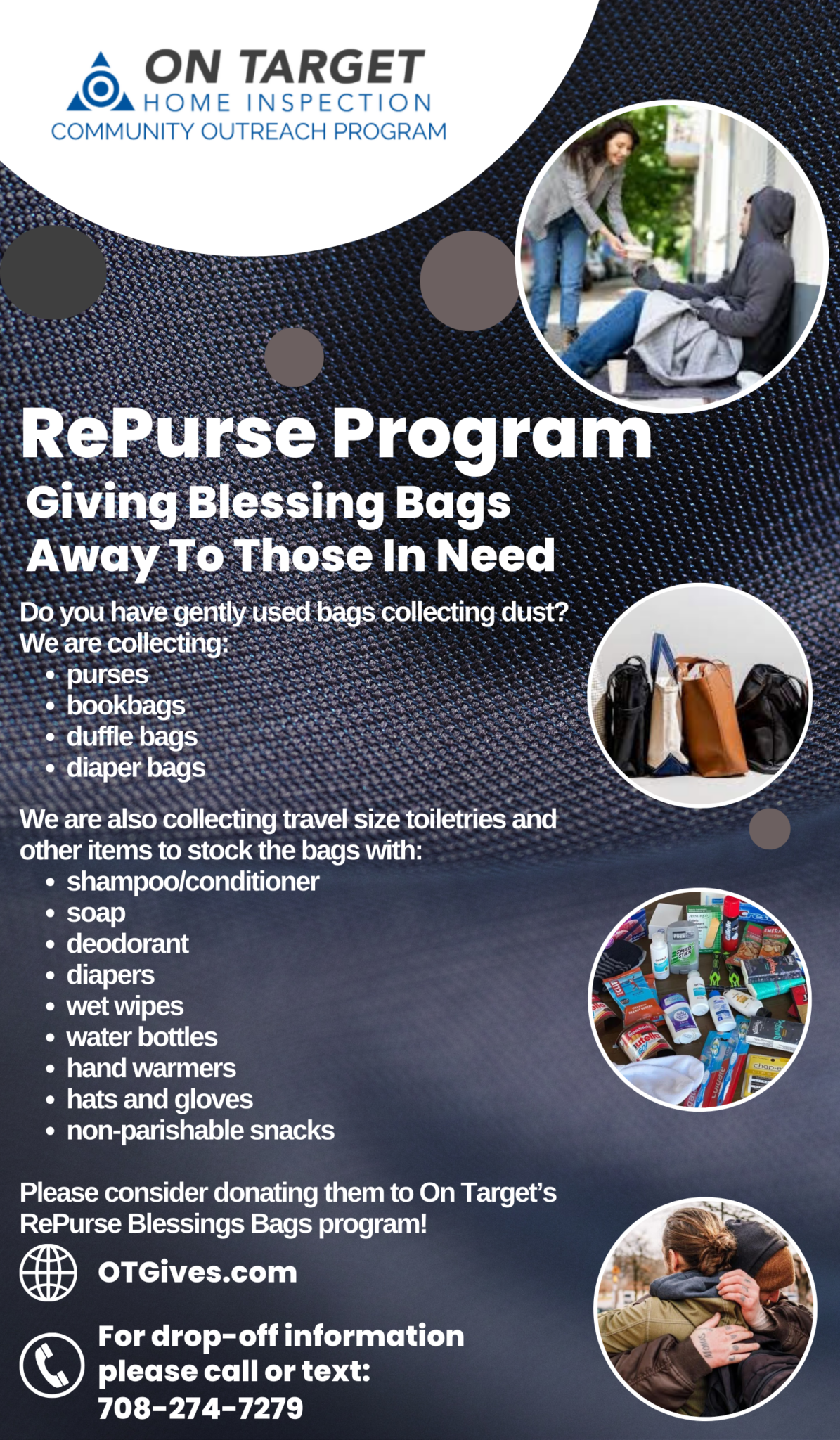 Through the Re-Purse Program, we collect gently used purses and bags and fill them with travel-size toiletries, feminine products, water, snacks, and other essentials to distribute to local homeless shelters. This winter, we are also adding hats and gloves to help provide extra warmth during the cold months.